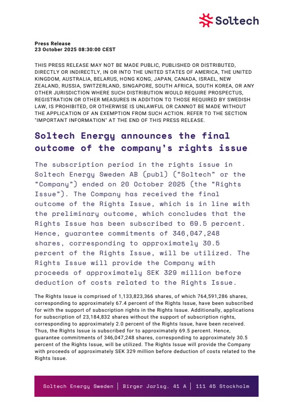 The subscription period in the rights issue in Soltech Energy Sweden AB (publ) (“Soltech” or the “Company”) ended on 20 October 2025 (the “Rights Issue”). The Company has received the final outcome of the Rights Issue, which is in line with the preliminary outcome, which concludes that the Rights Issue has been subscribed to 69.5 percent. Hence, guarantee commitments of 346,047,248 shares, corresponding to approximately 30.5 percent of the Rights Issue, will be utilized. The Rights Issue will provide the Company with proceeds of approximately SEK 329 million before deduction of costs related to the Rights Issue.
