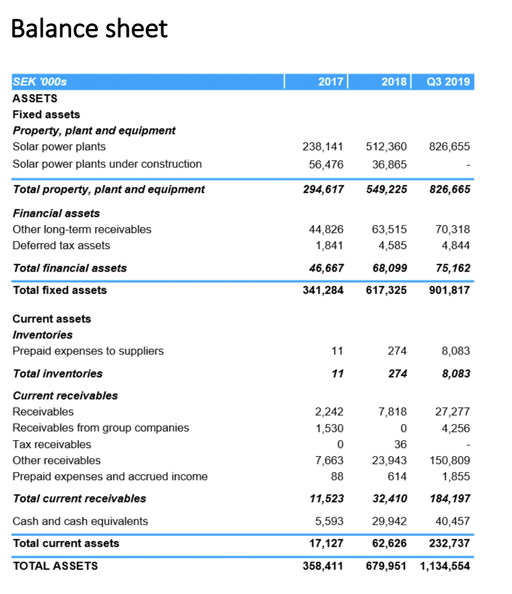 ASAB is in a strong expansion phase and had, as of December 31, 2019, an installed capacity of 139.2 MW in its portfolio of solar power plants with an annual revenue capacity of approximately SEK 161 million and EBITDA of approximately SEK 141 million, given certain assumptions. The company has furthermore prepared combined financial statements for the Group in which ASAB is the parent company for the full year 2017 and 2018 and for the period 1 January 2019 – 30 September 2019