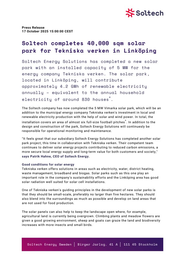 “It feels great that our subsidiary Soltech Energy Solutions has completed another solar park project, this time in collaboration with Tekniska verken. Their competent team continues to deliver solar energy projects contributing to reduced carbon emissions, a more secure local energy supply and long-term value for both customers and society,” says Patrik Hahne, CEO of Soltech Energy.
