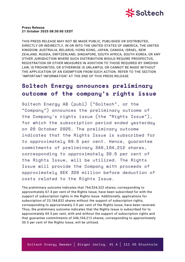 Soltech Energy AB (publ) (“Soltech”, or the “Company”) announces the preliminary outcome of the Company’s rights issue (the “Rights Issue”), for which the subscription period ended yesterday on 20 October 2025. The preliminary outcome indicates that the Rights Issue is subscribed for to approximately 69.5 per cent. Hence, guarantee commitments of preliminary 346,104,212 shares, corresponding to approximately 30.5 per cent of the Rights Issue, will be utilized. The Rights Issue will provide the Company with proceeds of approximately SEK 329 million before deduction of costs related to the Rights Issue.