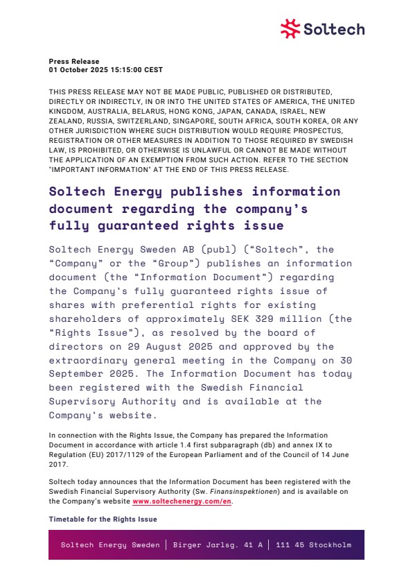 Soltech Energy Sweden AB (publ) (“Soltech”, the “Company” or the “Group”) publishes an information document (the “Information Document”) regarding the Company’s fully guaranteed rights issue of shares with preferential rights for existing shareholders of approximately SEK 329 million (the “Rights Issue”), as resolved by the board of directors on 29 August 2025 and approved by the extraordinary general meeting in the Company on 30 September 2025. The Information Document has today been registered with the Swedish Financial Supervisory Authority and is available at the Company’s website.