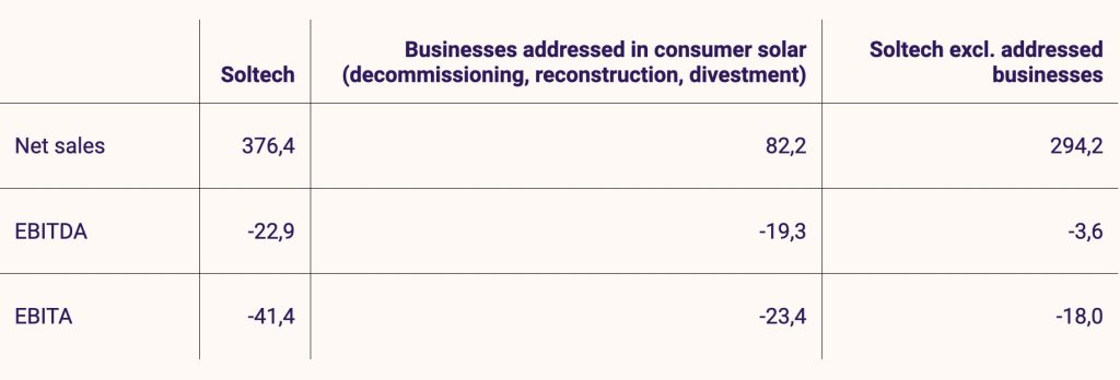 The Soltech Group’s earnings will be positively impacted by the announced structural changes in the consumer market and the sale of Soltech’s share in the subsidiary 365zon. Reported earnings excluding these parts are shown as follows. The businesses addressed are expected to be unprofitable overall in the fourth quarter as well.