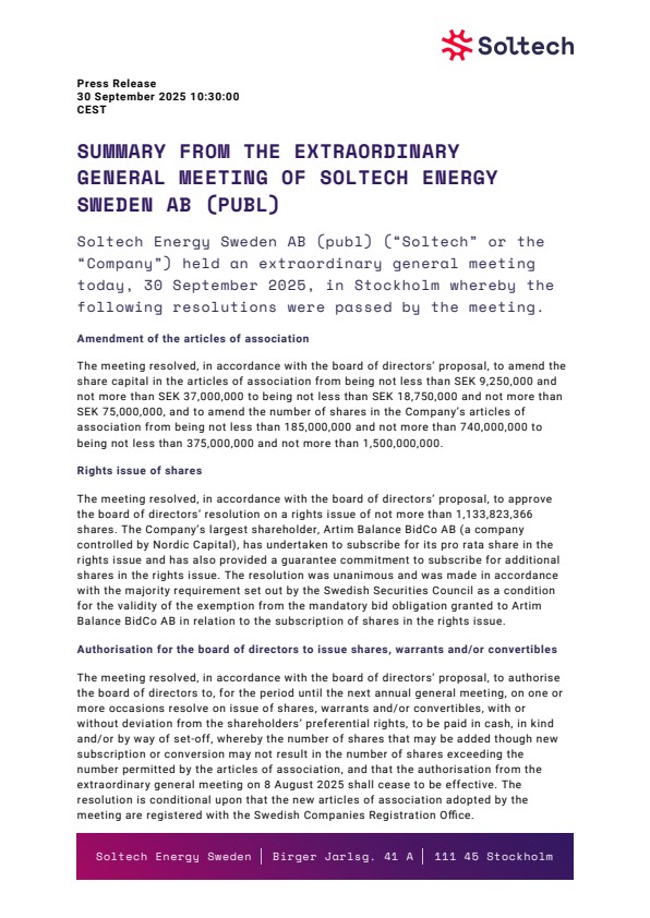 Soltech Energy Sweden AB (publ) (“Soltech” or the “Company”) held an extraordinary general meeting today, 30 September 2025, in Stockholm whereby the following resolutions were passed by the meeting.