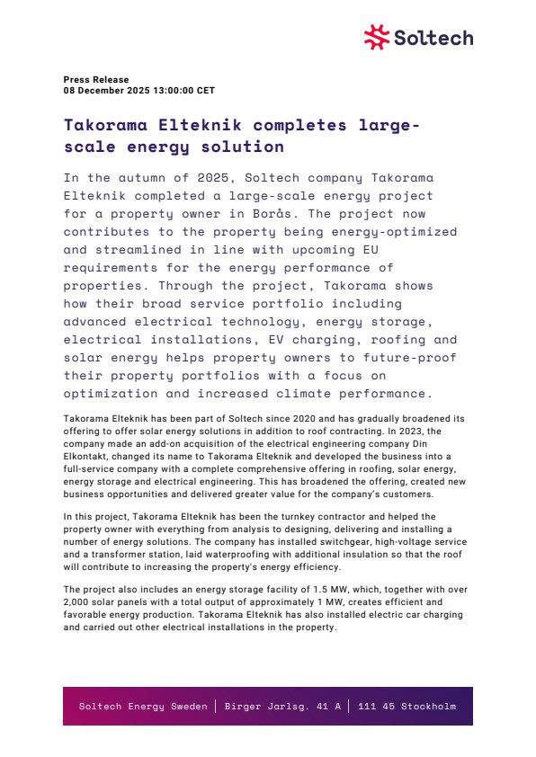 In the autumn of 2025, Soltech company Takorama Elteknik completed a large-scale energy project for a property owner in Borås. The project now contributes to the property being energy-optimized and streamlined in line with upcoming EU requirements for the energy performance of properties. Through the project, Takorama shows how their broad service portfolio including advanced electrical technology, energy storage, electrical installations, EV charging, roofing and solar energy helps property owners to future-proof their property portfolios with a focus on optimization and increased climate performance.