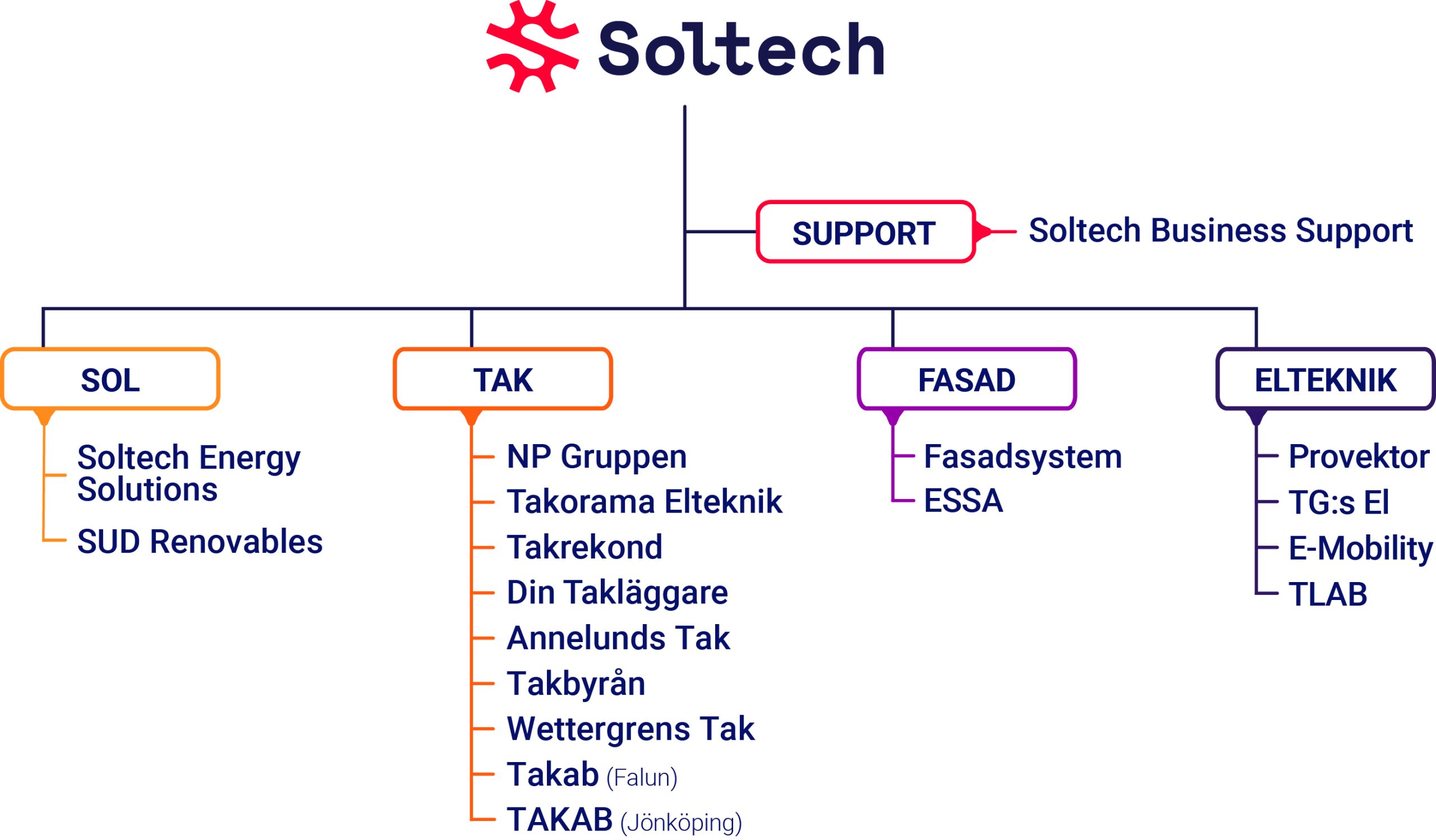 Soltechkoncernen skapar lösningar för samhällets gröna omställning med solenergi som plattform. Vi gör skillnad för alla våra kunder och aktieägare varje dag och vår ambition är att integrera solen i vardagen – allas vardag.
