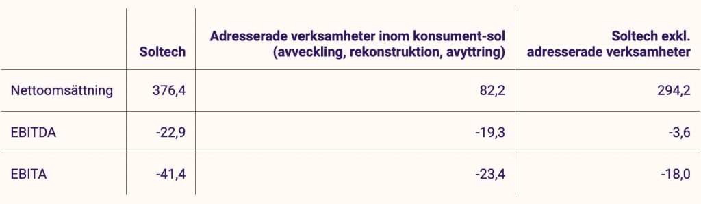 Soltechkoncernens resultat påverkas positivt av de annonserade strukturförändringarna inom konsumentmarknaden och försäljningen av Soltechs andel i dotterbolaget 365zon. Rapporterat resultat exklusive dessa delar framgår enligt nedan. De adresserade verksamheterna förväntas totalt sett vara olönsamma även under fjärde kvartalet.