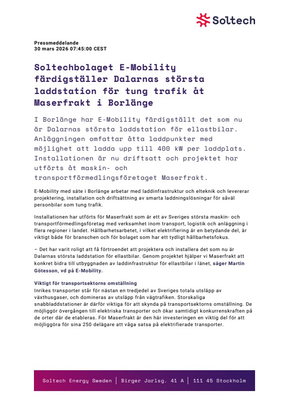 I Borlänge har E-Mobility färdigställt det som nu är Dalarnas största laddstation för ellastbilar. Anläggningen omfattar åtta laddpunkter med möjlighet att ladda upp till 400 kW per laddplats. Installationen är nu driftsatt och projektet har utförts åt maskin- och transportförmedlingsföretaget Maserfrakt.